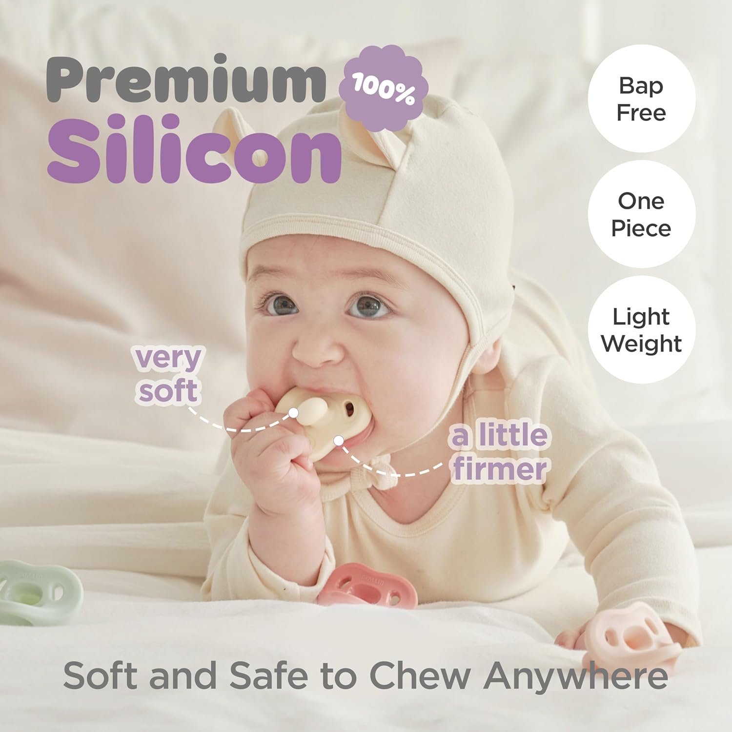 آمنة ولطيفة: مصنوعة من السيليكون الناعم الطبي الخالي من المواد الكيميائية الضارة واللطيف على لثة الأطفال.