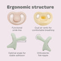 صُممت لهاية مويوم المصنوعة من السيليكون بتصميم ماكارون مع غطاء واقٍ لتوفير الراحة والأمان للأطفال، مع توفير الراحة للآباء. مصنوعة من سيليكون بلاتيني طبي 100%، وهي ناعمة ومتينة ولطيفة على بشرة الطفل الحساسة. تتميز بحلمة مسطحة وتقويمية بزاوية 6 درجات لتعزيز نمو فموي صحي، وتحتوي على فتحات تهوية لتحسين تدفق الهواء وتقليل خطر تهيج الجلد. تأتي المجموعة مع غطاء واقٍ خفيف الوزن وصحي لسهولة التخزين والنقل، مما يحافظ على نظافة اللهاية وجاهزيتها للاستخدام. تتوفر اللهاية بألوان باستيلية هادئة، مثل الوردي القطني، والتوت الأزرق، والمريمية.