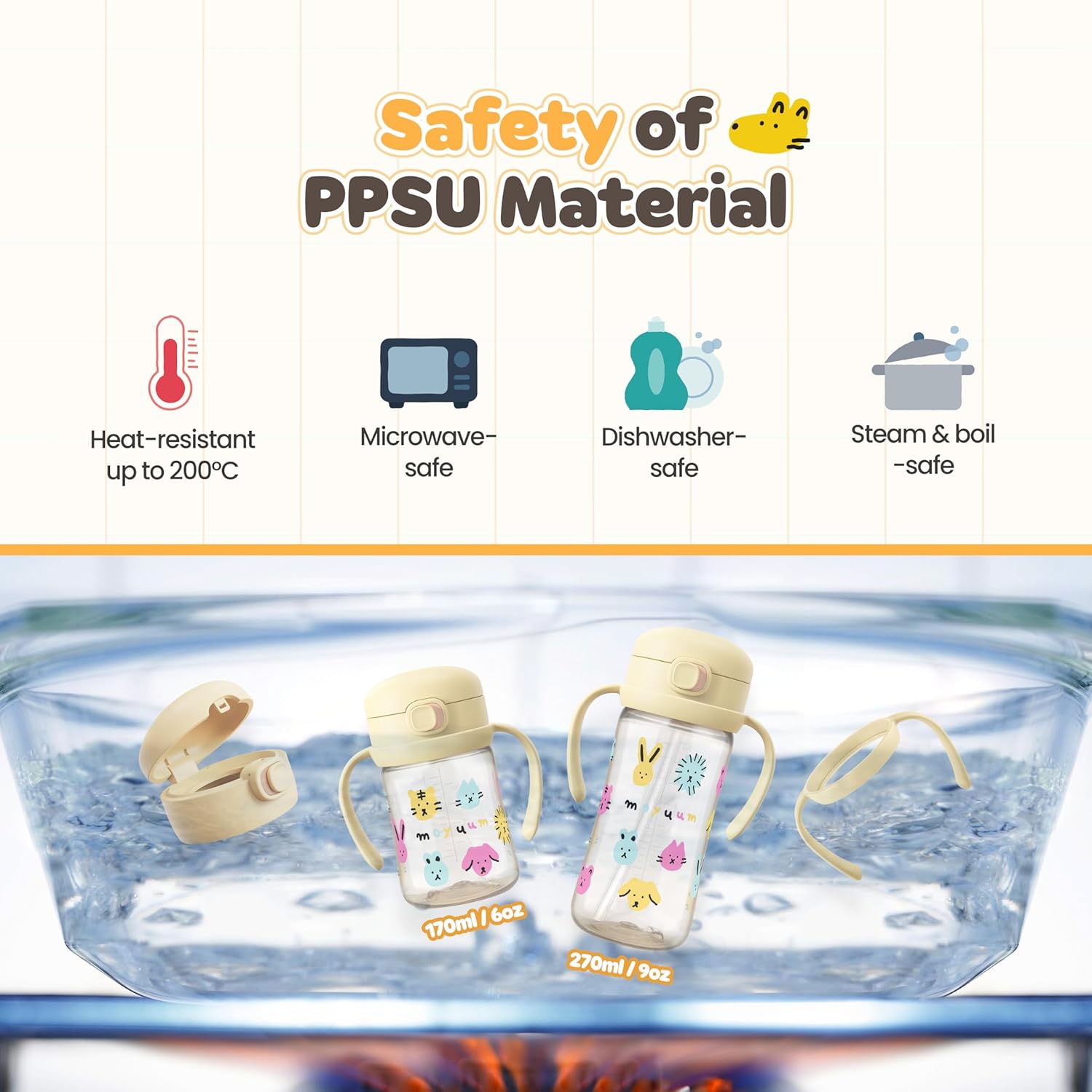 The Moyuum Straw Cup is designed to help babies transition from bottle-feeding to independent drinking. Made from BPA-free PPSU, it's durable and heat-resistant up to 200°C. The cup features a one-touch flip-top lid, a secure sliding lock, and a 360° rotatable straw with a gravity ball, allowing drinking from any angle. It comes in a 170ml size and includes detachable handles for small hands.
