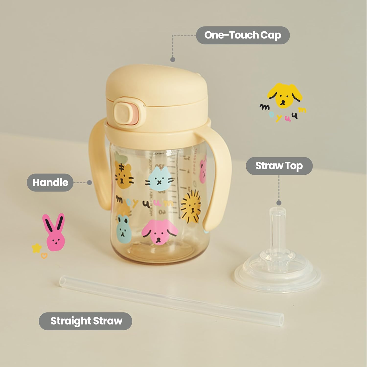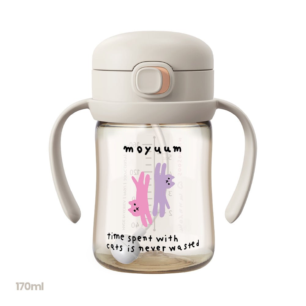 The Moyuum Straw Cup is designed to help babies transition from bottle-feeding to independent drinking. Made from BPA-free PPSU, it's durable and heat-resistant up to 200°C. The cup features a one-touch flip-top lid, a secure sliding lock, and a 360° rotatable straw with a gravity ball, allowing drinking from any angle. It comes in a 170ml size and includes detachable handles for small hands.