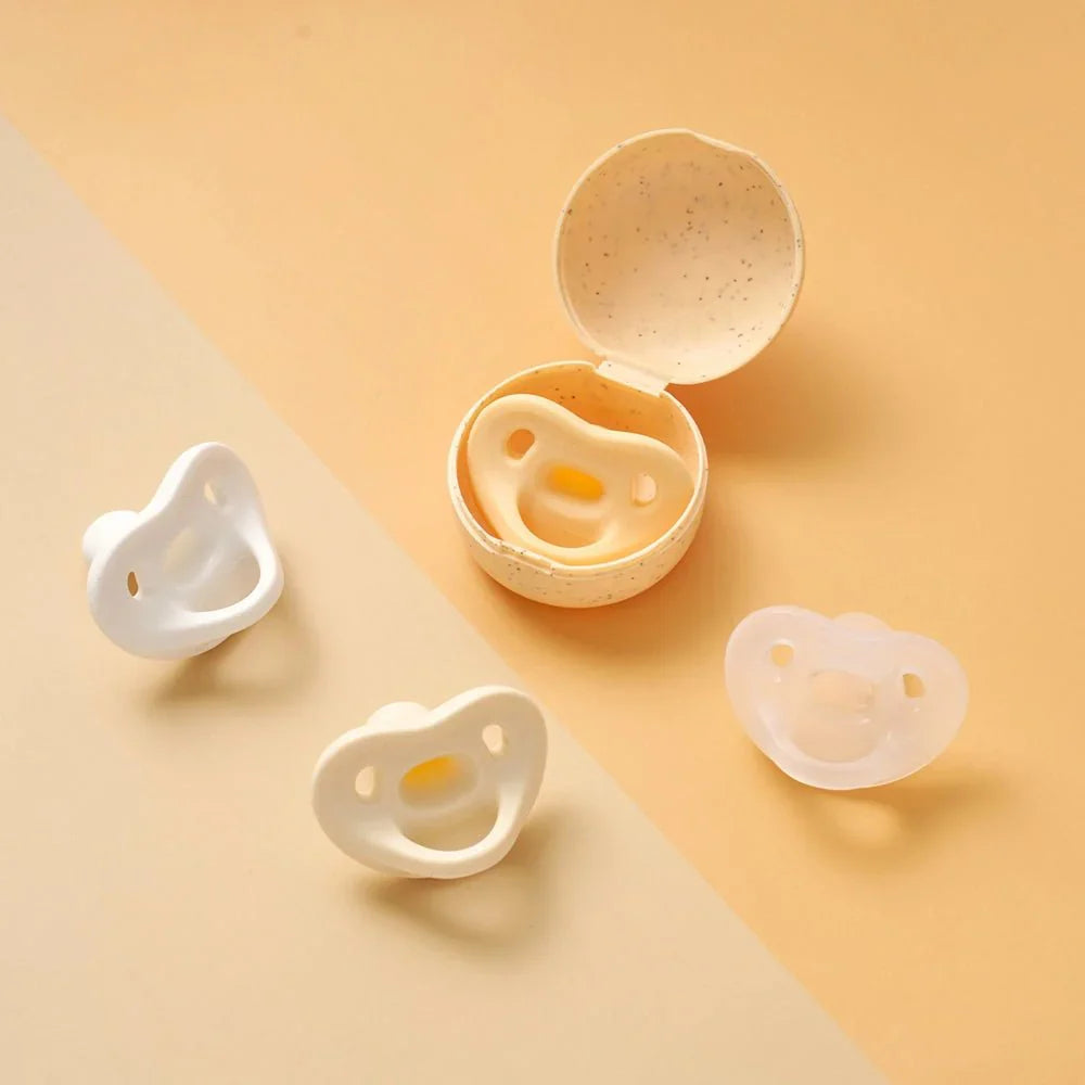 The Moyuum Silicone Macaron Pacifier with Protective Case is designed to provide both comfort and safety for babies while offering convenience for parents. Made from 100% medical-grade platinum silicone, the pacifier is soft, durable, and gentle on a baby’s sensitive skin. It features a flat, orthodontic nipple angled at 6 degrees to promote healthy oral development and includes ventilation holes to improve airflow and reduce the risk of skin irritation. The set comes with a lightweight, hygienic protective case for easy storage and transport, keeping the pacifier clean and ready for use. The pacifier is available in various soothing pastel colors, such as Cotton Pink, Blueberry, and Sage.