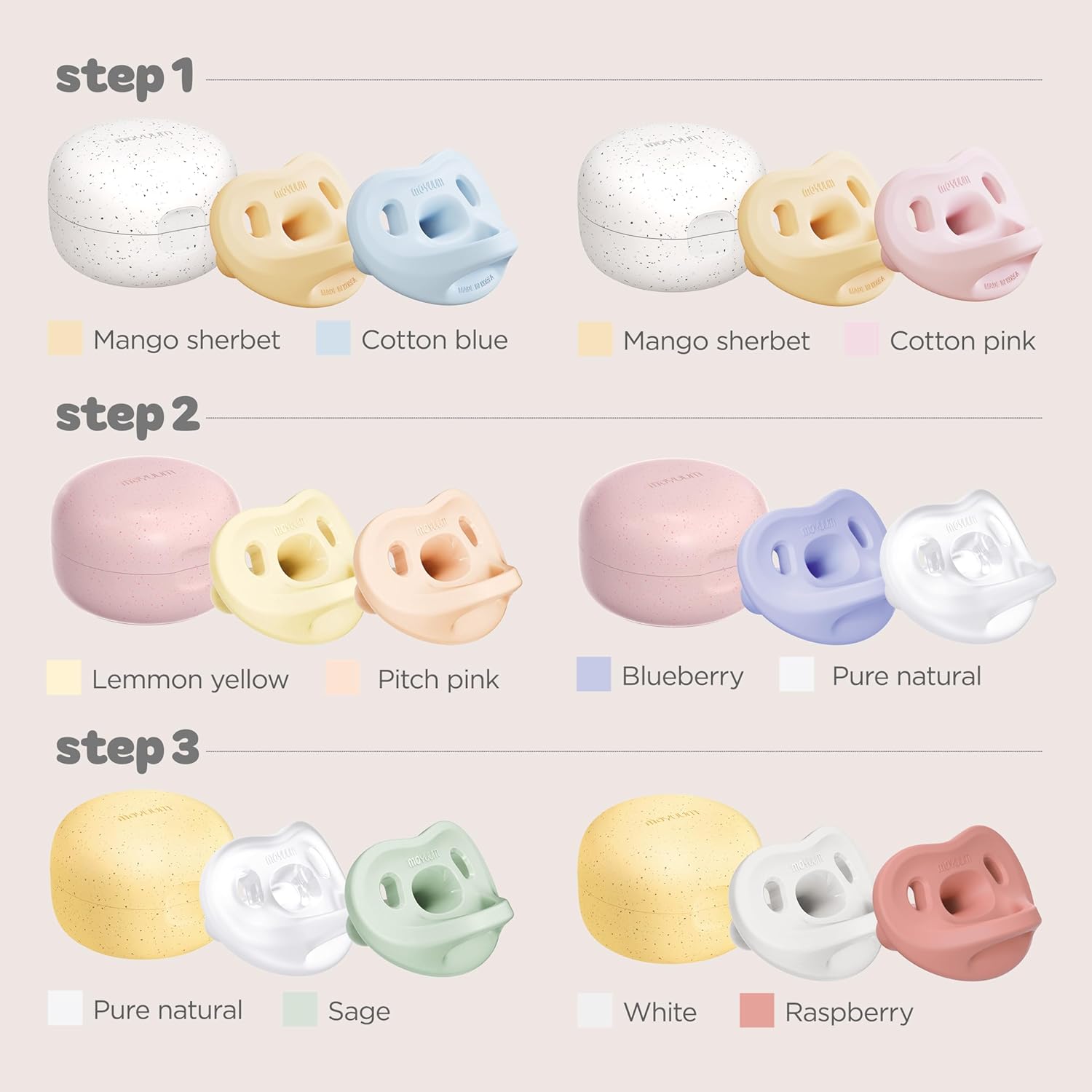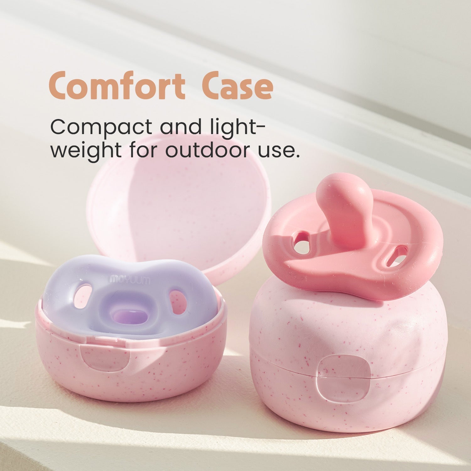 The Moyuum Silicone Macaron Pacifier with Protective Case is designed to provide both comfort and safety for babies while offering convenience for parents. Made from 100% medical-grade platinum silicone, the pacifier is soft, durable, and gentle on a baby’s sensitive skin. It features a flat, orthodontic nipple angled at 6 degrees to promote healthy oral development and includes ventilation holes to improve airflow and reduce the risk of skin irritation. The set comes with a lightweight, hygienic protective case for easy storage and transport, keeping the pacifier clean and ready for use. The pacifier is available in various soothing pastel colors, such as Cotton Pink, Blueberry, and Sage.